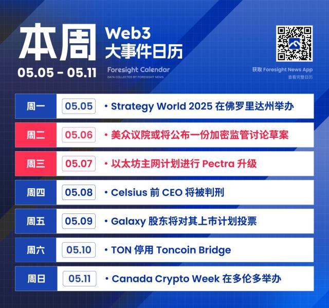 Key industry events and project developments worth paying attention to in the coming week, subscribe with one click to grasp market pulse anytime, anywhere. Web3 events not to be missed this week (May 5-11, 2025), here's a preview: Monday (May 5): Shardeum will conduct TGE on May 5, about to announce airdrop and token allocation details. Strategy World 2025 (formerly MicroStrategy World) will be held from May 5-8 in Florida, USA. Ethena (ENA) will unlock approximately 171 million tokens on May 5, valued at around $50 million, representing 3.10% of circulating supply. Tuesday (May 6): Sources indicate that Republican leadership from the House Financial Services and Agriculture Committees will publish a draft discussion for an important regulatory framework for digital assets before the hearing on May 6. The draft is expected to be similar to the Financial Innovation and Technology for the 21st Century Act (FIT 21) passed by the House last year. The bill aims to clarify when the SEC, CFTC, or both will regulate digital assets. Wednesday (May 7): Ethereum core developers plan to conduct the Pectra upgrade on the Ethereum mainnet on May 7. Binance Alpha and Binance Futures will list the token Obol (OBOL) at 18:00 and 18:30 on May 7. Thursday (May 8): The US court will sentence Celsius former CEO Alex Mashinsky on May 8. The proposal to recover ETH exchanged for ZK tokens in the ZK Nation airdrop theft will open for voting around 2:00 on May 8, with voting lasting 7 days. Considering potential arbitrage and market manipulation, the method and timing of ETH to ZK token exchange will not be disclosed in advance. Friday (May 9): Galaxy awaits shareholder approval for listing on May 9. If approved, Galaxy will list on Nasdaq on May 16. Saturday (May 10): TON will officially discontinue the Toncoin Bridge on May 10. Users will no longer be able to transfer Toncoin from TON to Ethereum or BNB Smart Chain, but previously cross-chain assets can still be claimed. Sunday (May 11): Canada Crypto Week will be held from May 11-17 in Toronto, Canada. a16z Speedrun application deadline is May 11. a16z Speedrun will provide up to $1 million investment to very early-stage startups. The next round will launch from July 28 to October 10, 2025. One-Click Subscription to FN Calendar FN Calendar supports one-click subscription on iOS, Mac, and Google Calendar, integrating the latest and most comprehensive Web3 Chinese calendar into your time management tools: How to Subscribe: Copy the FN Calendar subscription link (https://api.foresightnews.pro/v1/calendar.ics), open in browser, download the .ics file on your device, and open the file in the calendar app on iOS or MAC. For Google Calendar, go to settings, click import, and upload the file. Detailed FN Calendar subscription tutorial: https://foresightnews.pro/article/detail/4